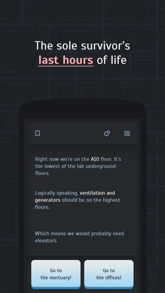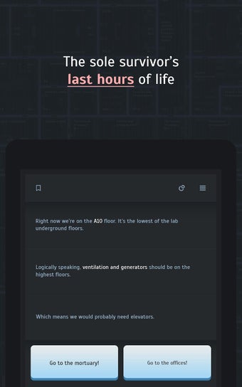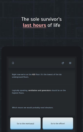 Di laboratorium, Anda menemukan kecerdasan buatan yang berkomunikasi dengan Anda. Kecerdasan buatan memberi Anda sejumlah pilihan dan Anda harus membuat keputusan yang tepat untuk bertahan hidup.